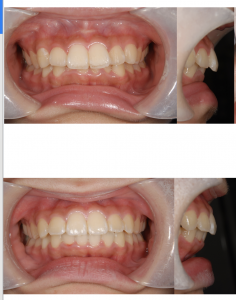 ディープバイトを治す時にいつも悩ましいのが、裏側矯正では上の歯の裏側の矯正装置に下の前歯が噛み込んでぶつかってしまうことです。表側矯正では下の前歯につけた装置に上の前歯がぶつかってきます。このような場合には装置が取れやすく、治療が進まなくなる原因となりますので、バイトアップを行います。ちなみに透明なマウスピース型矯正装置のインビザラインではこのようなことはありません。