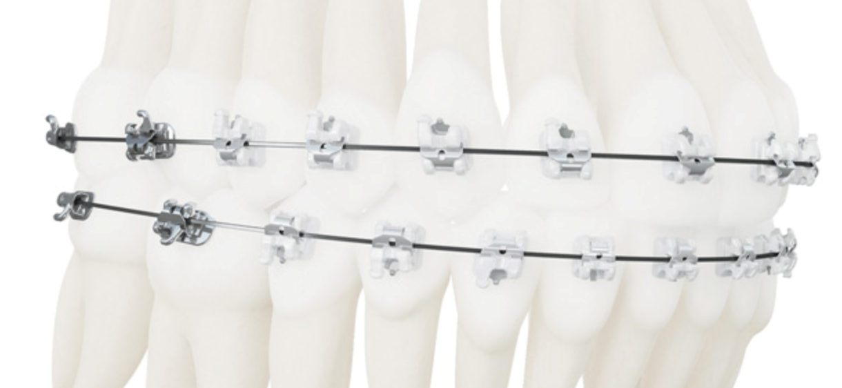 通常のシルバータイプのワイヤーです。たわみや力の持続性、アーチの形態などによって多くの種類があります。白いワイヤーの内部もこれらの金属が使用されており、矯正機能に優れています。口もとが目立ちやすくなるものの、価格はほかの装置に比べて低くなります。